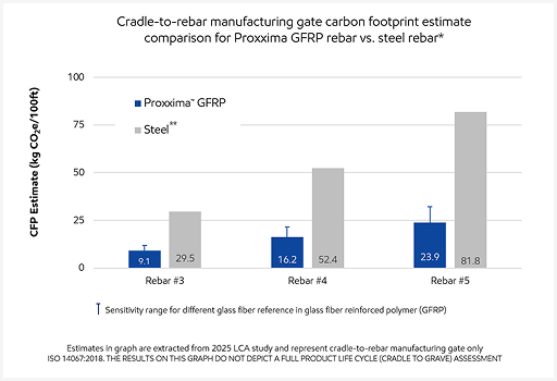 *Source: Carbon Footprint of Product of Reinforcing Bars: Steel and ProxximaTM Resin containing Glass Fiber Reinforced Polymer (GFRP) in Construction Applications, May 2025, prepared by ExxonMobil Technology and Engineering Company. The study was conducted to be in accordance with ISO 14067:2018 (Greenhouse gases – Carbon footprint of products – Requirements and guidelines for quantification). The study was confirmed to be conducted according to and in compliance with ISO 14067:2018 by an independent third party (Sphera Solutions, Inc.) critical review which followed ISO 14071:2024 to support comparative environmental footprint communications as defined in ISO 14026:2018.