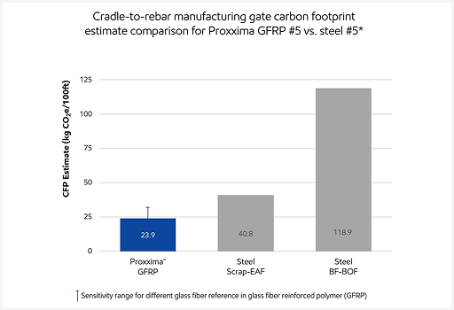 Proxxima GFRP rebar’s estimated CFP is ~40% lower than steel rebar from the scrap-EAF steel production route