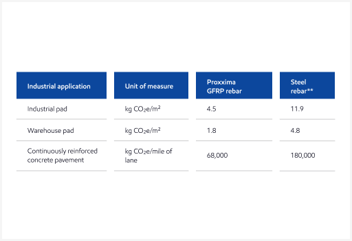 ‡Cradle-to-end-of-life estimation assumes equivalent areas of steel and Proxxima GFRP rebar provide the same function (both products were installed with the same concrete mixture and thickness).